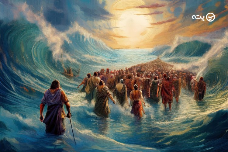 • با فرمان الهی، مسیر آب شکافته شد و راهی خشک برای عبور قوم بنی‌اسرائیل باز شد.